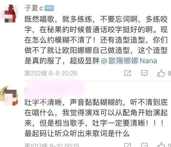 虽然粉丝和水军一水儿的无脑吹,什么开口跪,惊艳,所有好的形容词都用在了自家爱豆身上,但还是有网友说出了实话。不少网友表示,欧阳娜娜的《平凡之路》太过难听,难听到差点儿把人送走。粉丝虽然极力维护正主,但还是在欧阳娜娜的工作室账号留言,想当歌手就要练吐字,咬字含糊不清,根本不知道欧阳娜娜在唱啥。